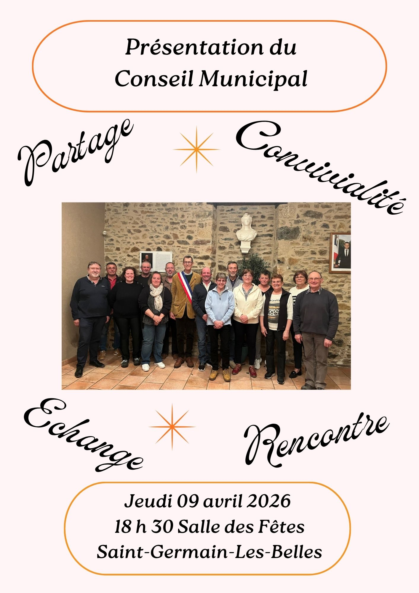Marc Ditlecadet, Maire de Saint-Germain-les-Belles, ainsi que les membres de la nouvelle équipe municipale, ont le plaisir d’inviter les administrés à venir faire leur connaissance et à partager un verre de l’amitié.